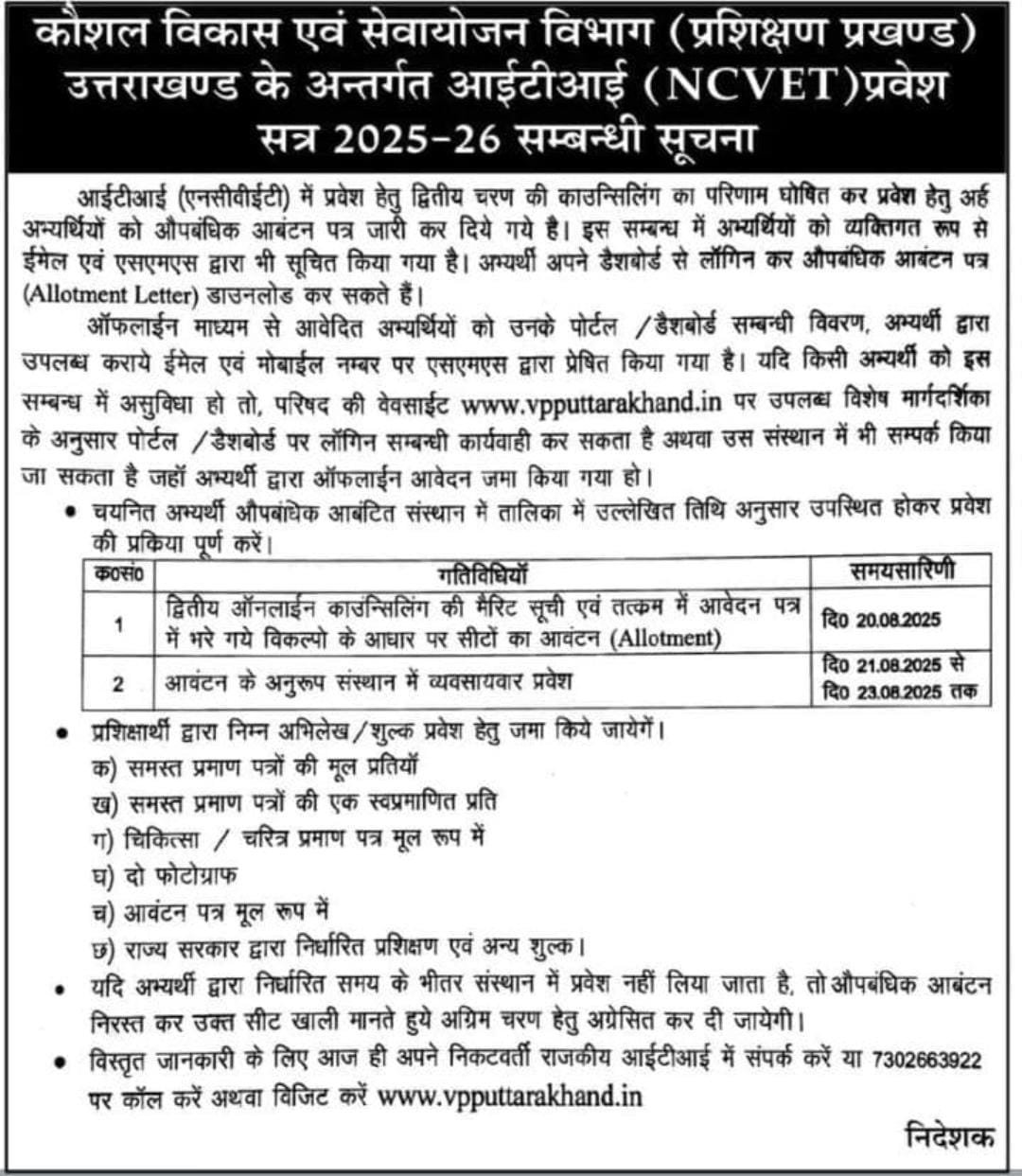 आई.टी.आई में द्वितीय काउंसलिंग के पश्चात् आज दिनांक 21.08.2025 से दिनांक 23.08.2025 तक प्रवेश प्रारम्भ हो चुके हैं
